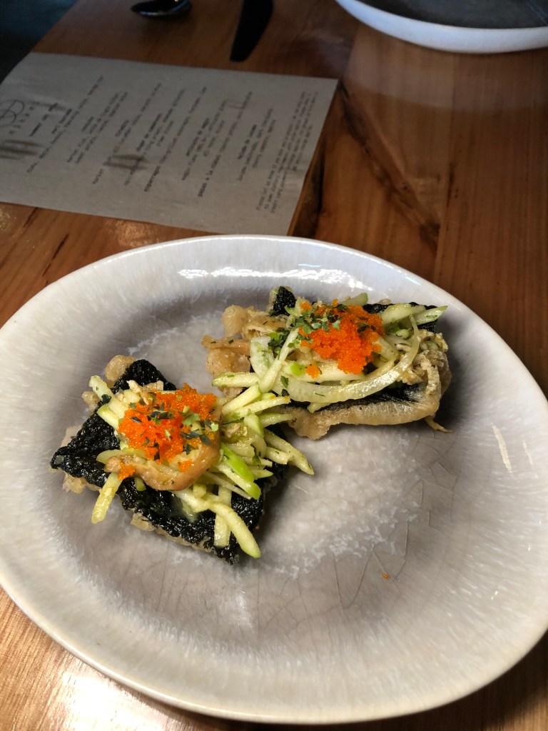 The entree dishes were unique and delicious, although both leaned towards the more sour/acidic side. The nori tostadas was extra salty, enough to balance out the acidic fennel and apple pieces, while the roe pieces offered a nice pop of umami to finish off the dish. These were so unique, definitely one of my favourite starters!