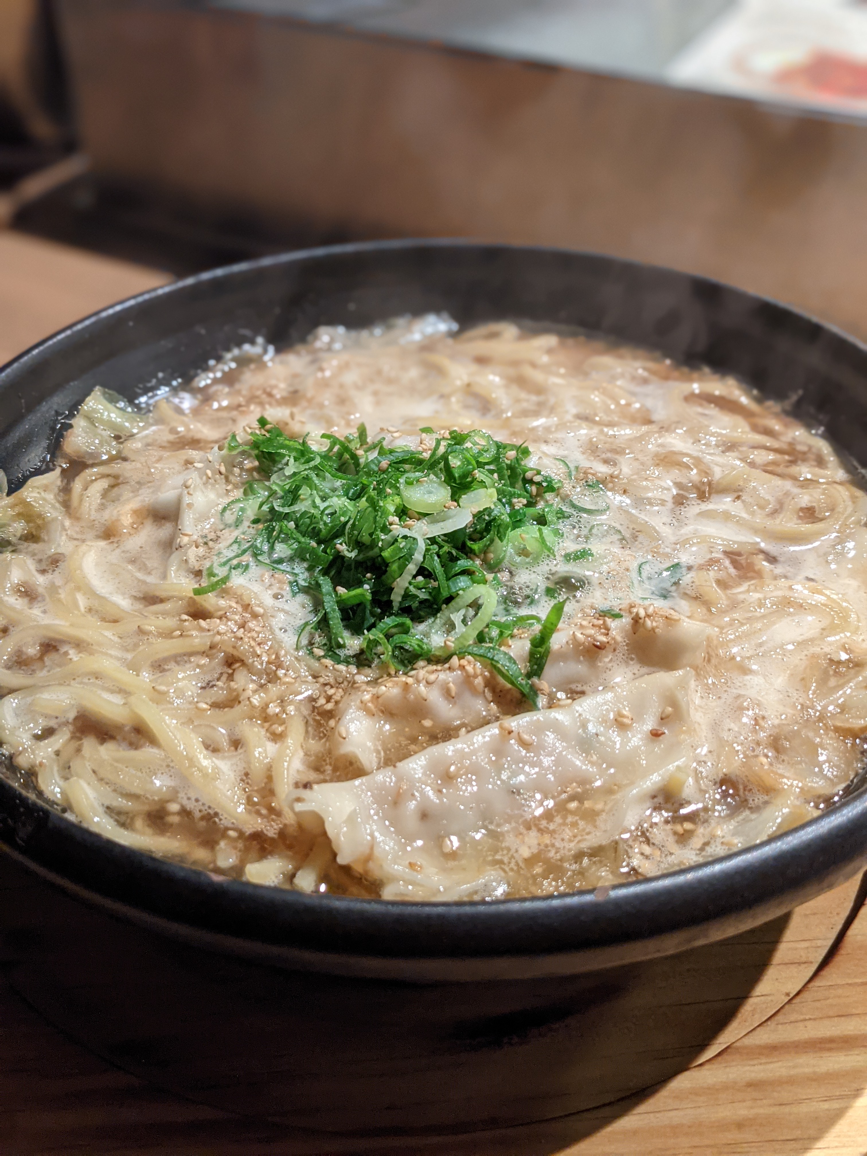 Next dish was shared between 2, and is a house recipe pork gyoza & super thick ramen. After the premium selection and a round of skewers it was really good timing to get some hot broth and soup in. This dish comes out like a hotpot, piping hot in the stone bowl and was pretty decent. The gyoza was really good and tasted really fresh, like it was handmade that day. I really enjoyed the broth, it was a thicker, salty ramen broth and was perfect for the cold and rainy day.