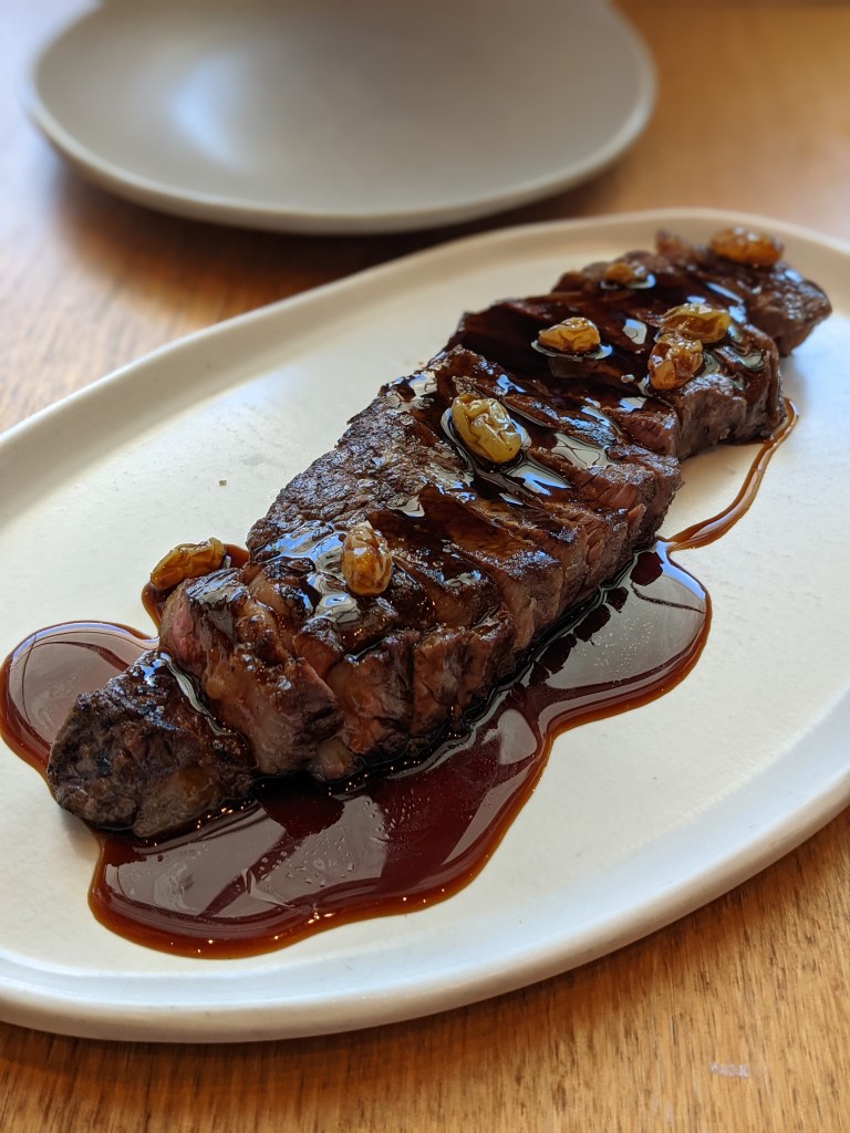The set menu comes with two mains, the Steamed Snapper with Malt Vingar Egg Sauce and Baby Spinach, and the Rangers Valley Black Tyde Striploin with Beef Jus. The Malt Vinegar Egg Sauce was certainly interesting, a creamy yet sour taste which we had mixed first impressions on but once all elements were combined, it went alright. The fish was cooked really well, soft and moist and the Baby Spinach added much needed savouriness. Overall an okay dish but felt like it was missing something to really take it to the next level.
