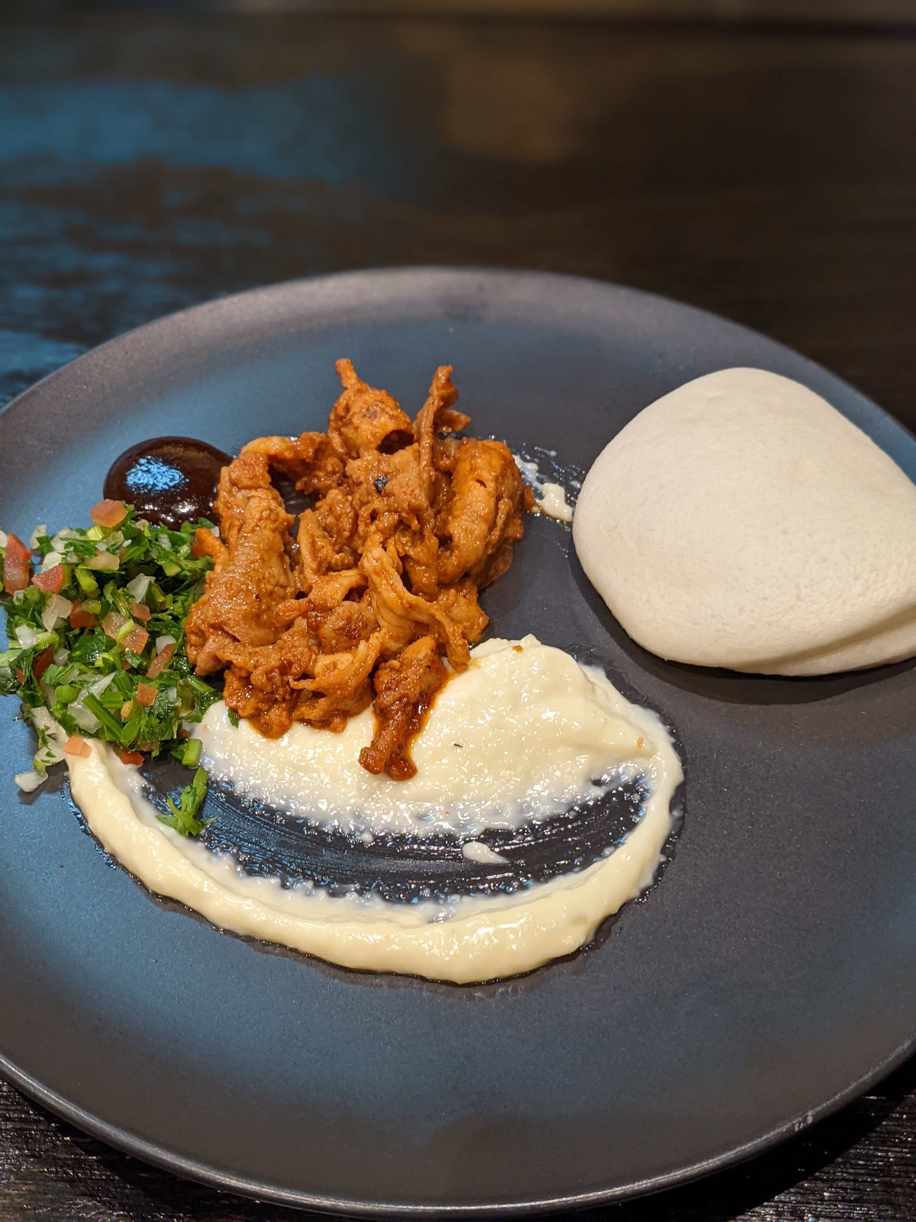 The Chilli Pork Bao Bun was my highlight and favourite dish of the entire menu. All elements on the plate – pork, tabouli, garlic and teriyaki sauce are mixed together before tucked in the fluffy bao and eaten like a bun. Great combination of flavours here, some kick from the pork, creaminess from the garlic sauce, sourness from the tabouli and saltiness from the teriyaki. An awesome dish I would go back for in a heartbeat.