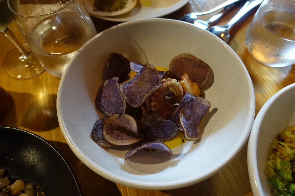 The final entree was the fried octopus with a yellow capsicum sauce, capers and sweet potato chips. It wasn’t until I saw this photo that I remembered we even ordered this dish, so pretty unmemorable for me.