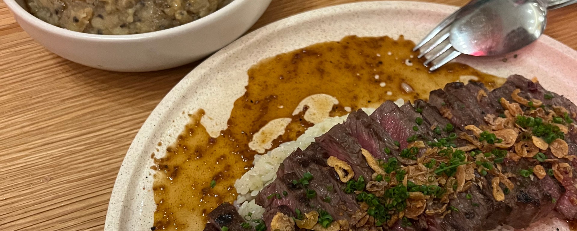And finally the pièce de résistance(s) of the night – the wagyu tongue and wagyu striploin. The wagyu tongue was served in three rows, all offering a different level of cooking from rare, medium and well done. The best level for me was well done, where the meat was no longer as raw – I found the rare version to be a bit too chewy for me. There was a lovely smokey flavour and the salt alone was enough to bring out the beefiness. The wasabi mustard was a nice accompaniment, but adding this I felt overwhelmed the meat.