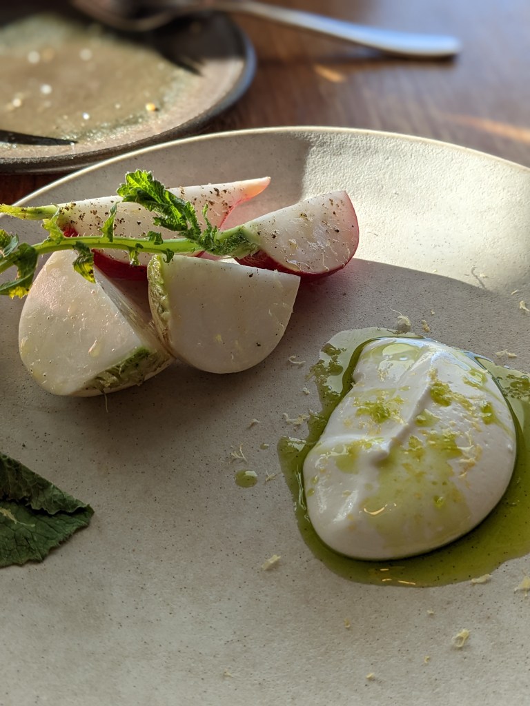 Next were the Asparagus with Mussels and Roe and the Raw Horseradish, two fairly polarising dishes. The Asparagus dish was great, cooked with a bit of charring and with a nice sweet and acidic sauce that went well with the mussels. The Horseradish came with a yogurt sauce which was bland and to go alongside raw radish which already doesn’t have much flavour, it didn’t really hit the mark for me. However it may be my ignorance showing, as this dish may have represented simply a palette cleanser but I personally didn’t really enjoy it.