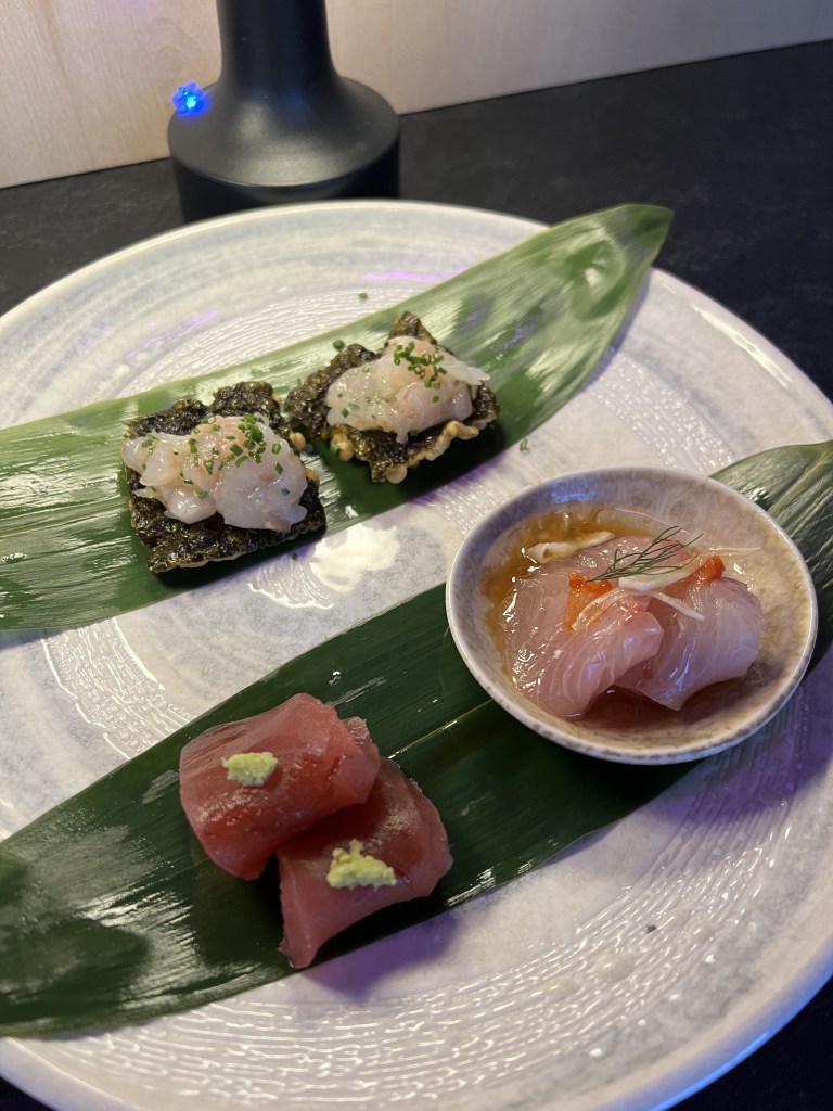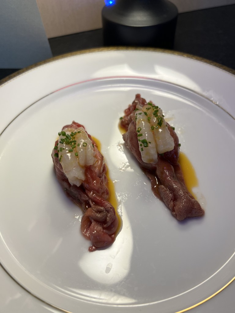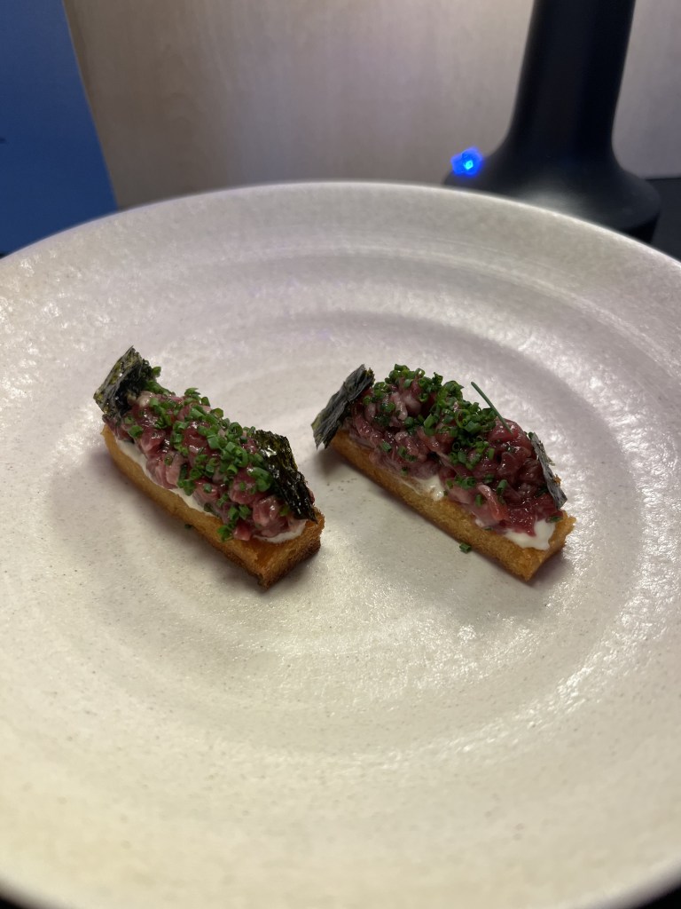 Wagyu toast – toasted and heavily buttered sourdough with wagyu tartare on top in a miso cream and two pieces of nori. Really delicious bite, but it was definitely very small, I could’ve eaten more of these! The simplicity of the dish did make me consider recreating this at home as well.