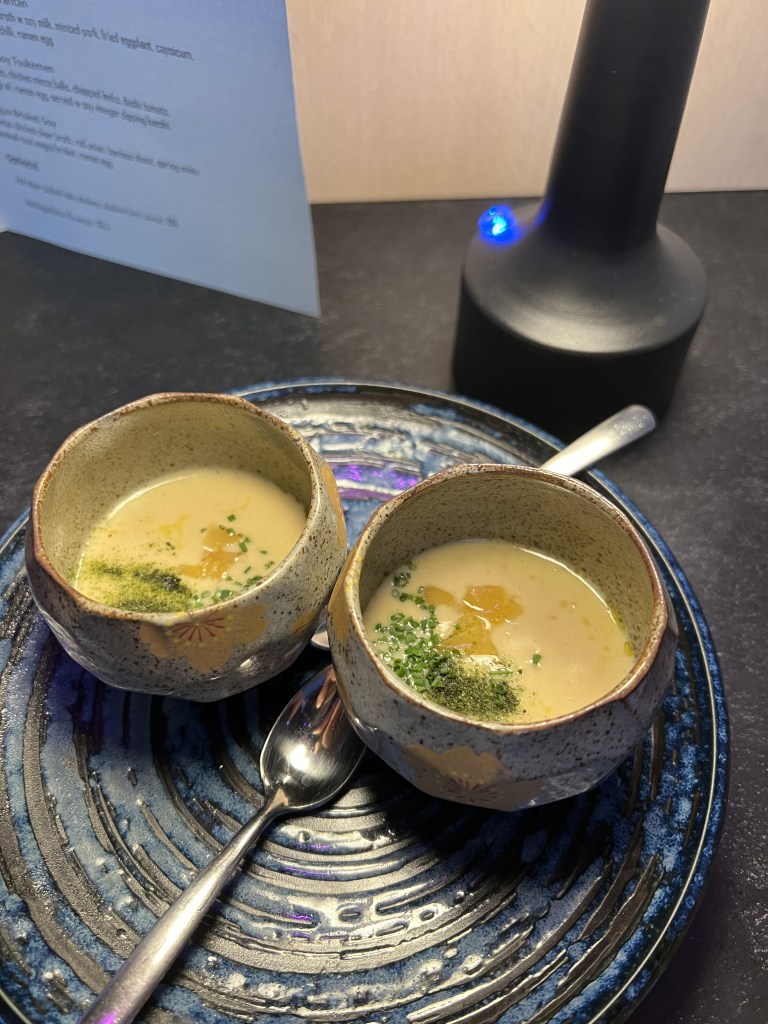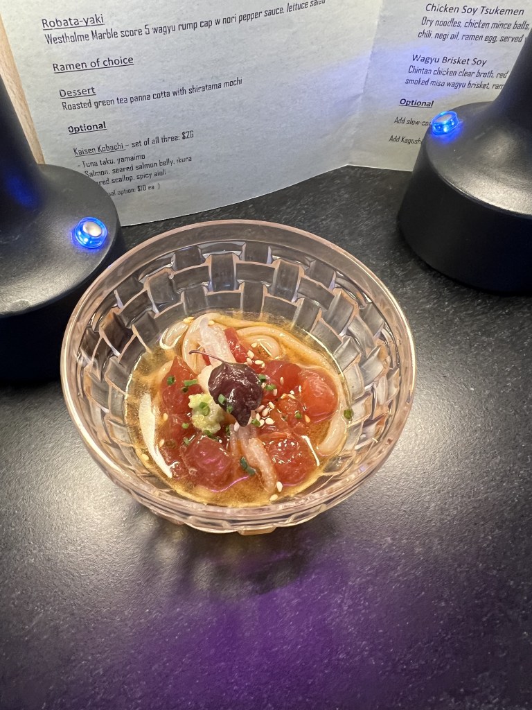Finally, we had a choice of a range of ramens on the menu. Most of the ramen was based on the same underlying Chintan chicken clear broth and switching out the condiments and protein, with the exception of the tonkotsu which was a 12-hour paitan pork broth. We ordered the tonkotsu and the wagyu brisket soy. Both ramens were delicious – salty silky soup paired with noodles perfectly made. The wagyu brisket soy was saltier of the two soups, whilst the tonkotsu was a lighter. These servings were definitely not the size of a normal ramen serving but did the job of filling you up given the omakase courses were fairly small. Definitely one of the strongest dishes of the night (I guess they are known for their ramen).