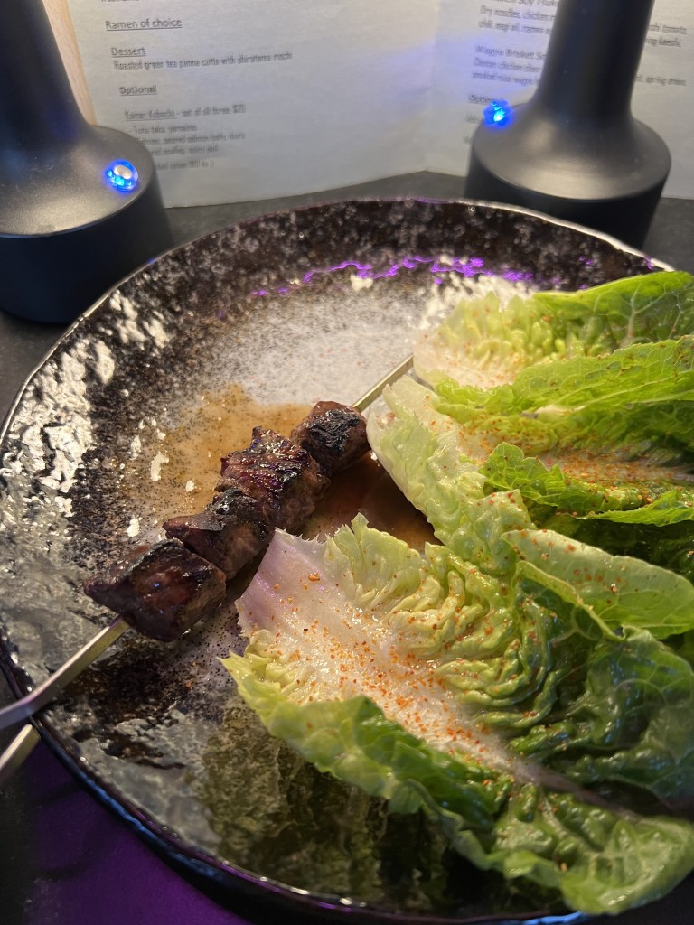 Wagyu rump cap skewers were the next course – tiny wagyu bites on a grill (two per person) served with cup lettuce leaves sprinkled with a spicy dusting. We were encouraged to wrap the lettuce around the wagyu and eat it in one piece. The wagyu had a bit of chew being from the rump but the lettuce cups added a nice crunch. I wish we had more of the meat as the lettuce felt much larger and it was fairly messy eating.