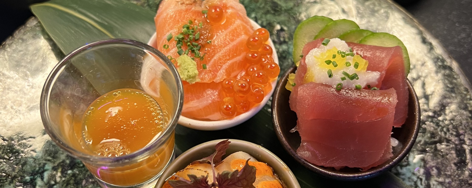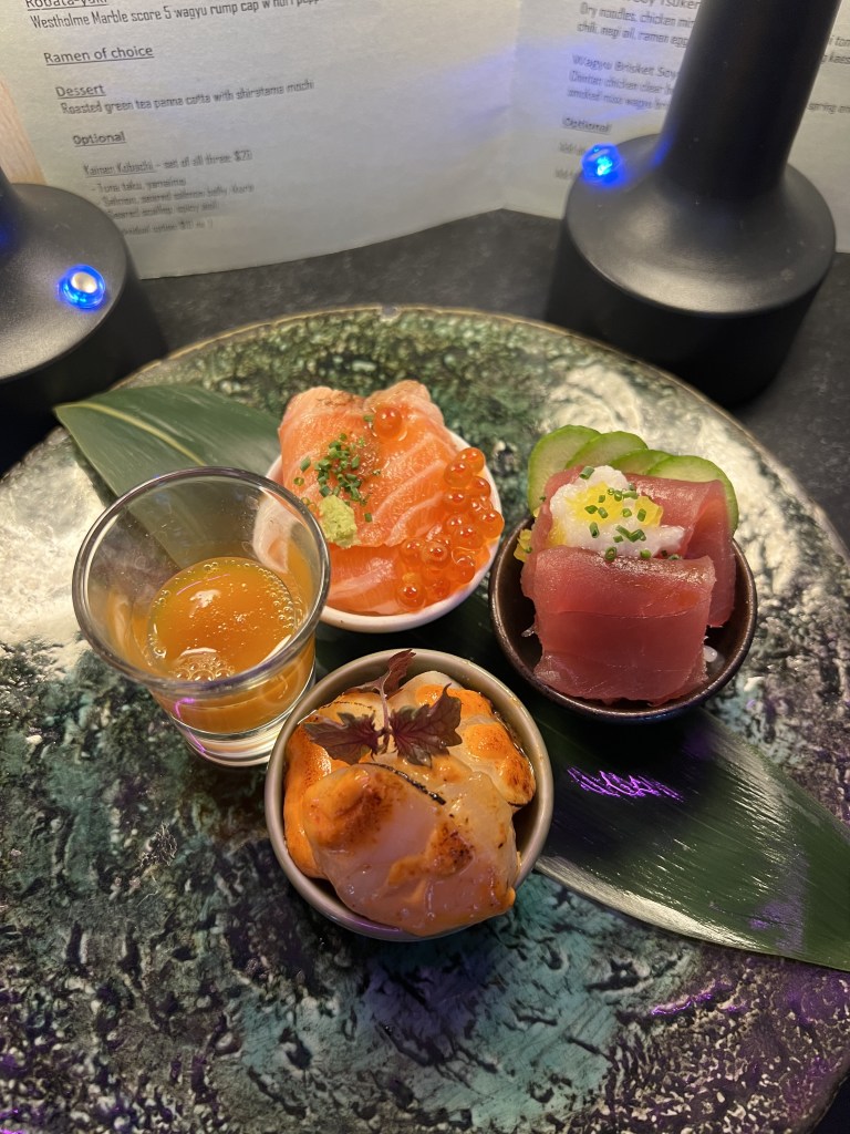 We chose to order the kaisen kobachi add on – this was $26 and we ordered one to share between two. I would recommend skipping this, it wasn’t anything too special that would add to the experience. Salmon sashimi with fish roe, tuna sashimi and scallops in a spicy aioli, served with an egg yolk ‘sauce’.
