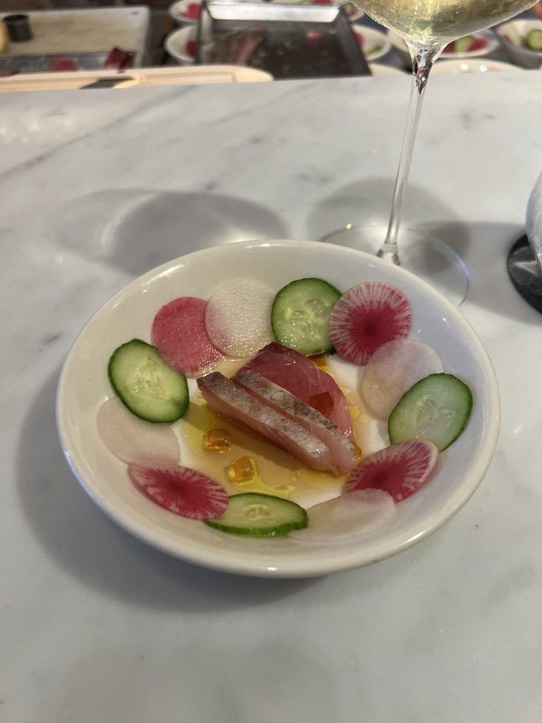 The salt and vinegar garfish was one of my favourite dishes that night – it was beautifully presented and a very modern and chic take on anchovy on toast. The fish was served with an olive brine, a delicious, spongey sourdough and soft yoghurt butter. You would dip the bread into the olive brine and oil combination (extra salty vs just olive oil), spread a bit of the butter and top it off with some slices of the garfish. A fun and interesting dish, and for someone who is a huge fan of cured fish, a winning dish.