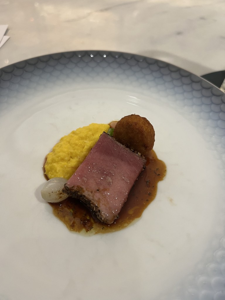 The final main course was a tuna dish that emulated a steak or small cut of fine beef. 10 day dry aged yellowfin tuna, lightly seated around the edges but perfectly pink inside. It was served with a a croquette stuffed with its fried belly, super fatty and salty, and a nice mix of smoked corn and rosemary.