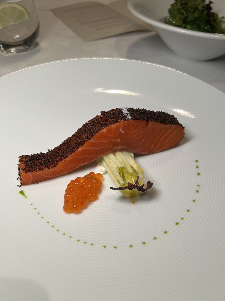 The star of the show was next, a dish (to quote our waiter) more recognisable than the chef himself’ and the signature dish for Tetsuyas for over 20 years. Tasmanian ocean trout with a light salad of apple. It was a beautifully executed dish, the trout was cooked right to the edge of being over (retaining its deep rich pink colour) and so soft you could cut it with a spoon and nearly no pressure. It was a lovely dish, served with a crumbed seaweed on top. Balanced well with the salad and roe, it definitely needed something acidic to balance out.
