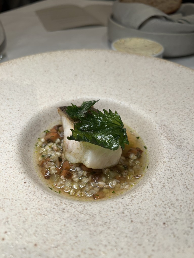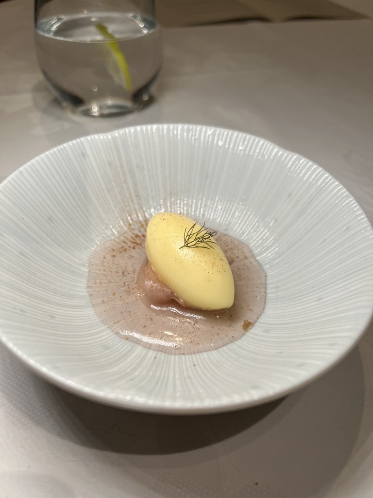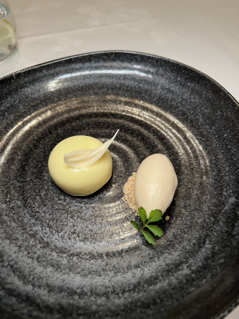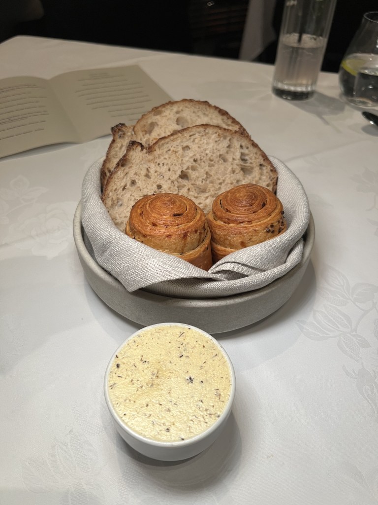 Next we were served some bread, which was truly the unsung hero of the meal. The seaweed croissants were delicious, buttery, flakey and the hints of salty seaweed definitely brought it to the next level, especially for someone who isn’t a huge sweet tooth. The sourdough was delicious and who can complain about truffled, whipped butter?