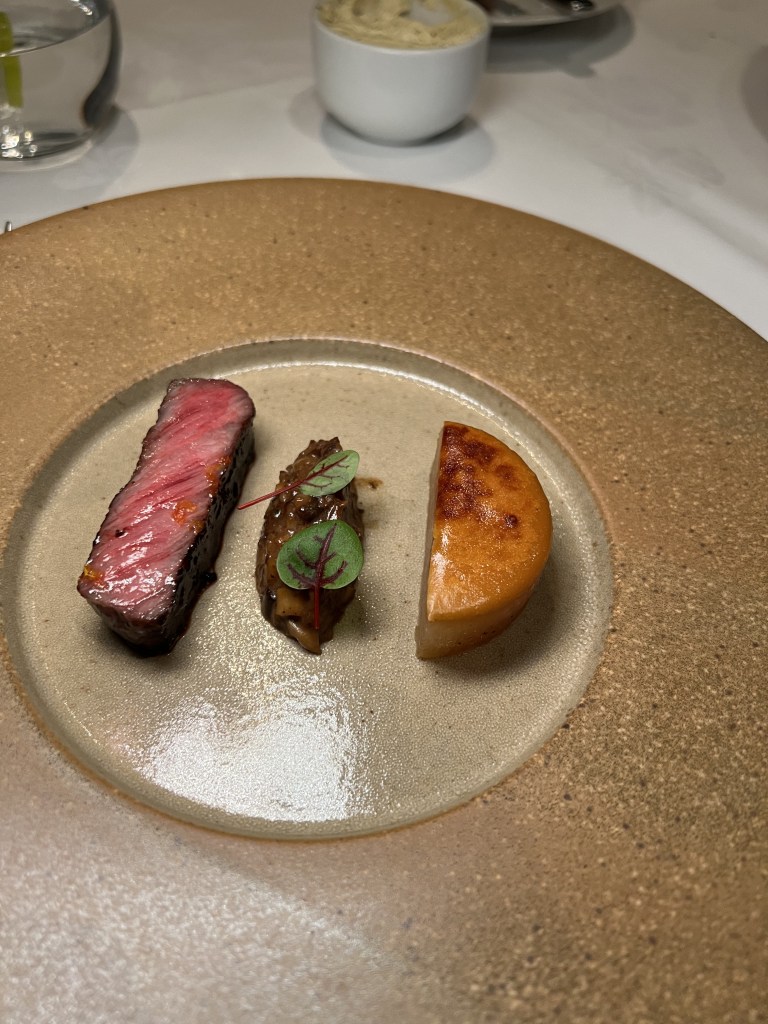 To finish off the mains we had A5 wagyu served with chestnut mushrooms and a braised daikon. The meat was delicious, so fatty it melted in our mouths. The daikon was unique and interesting – a good palette cleanser after the richness of the meat.
